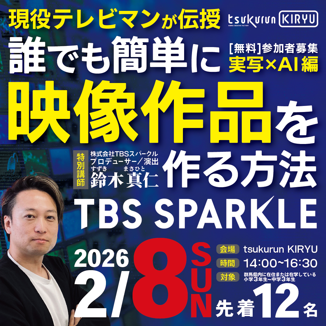 tsukurun KIRYU ☆2/8(日) ☆ 現役テレビマンが伝授!誰でも簡単に映像作品を作る方法 ~実写 ✕ AI編~【外部講師:株式会社TBSスパークル】