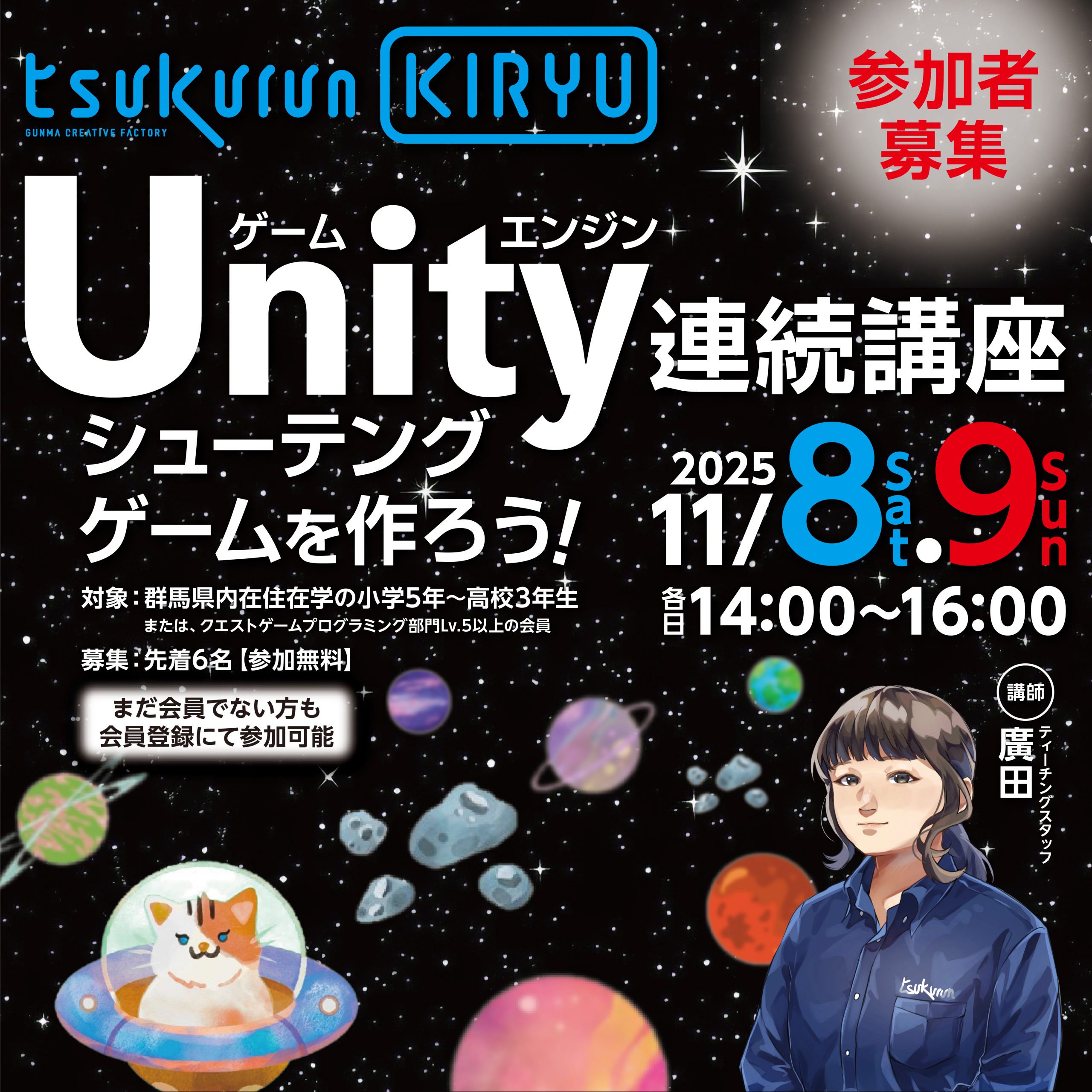 tsukurun KIRYU ☆11/8(土) 9(日)連続講座☆ Unity シューテングゲームを作ろう!