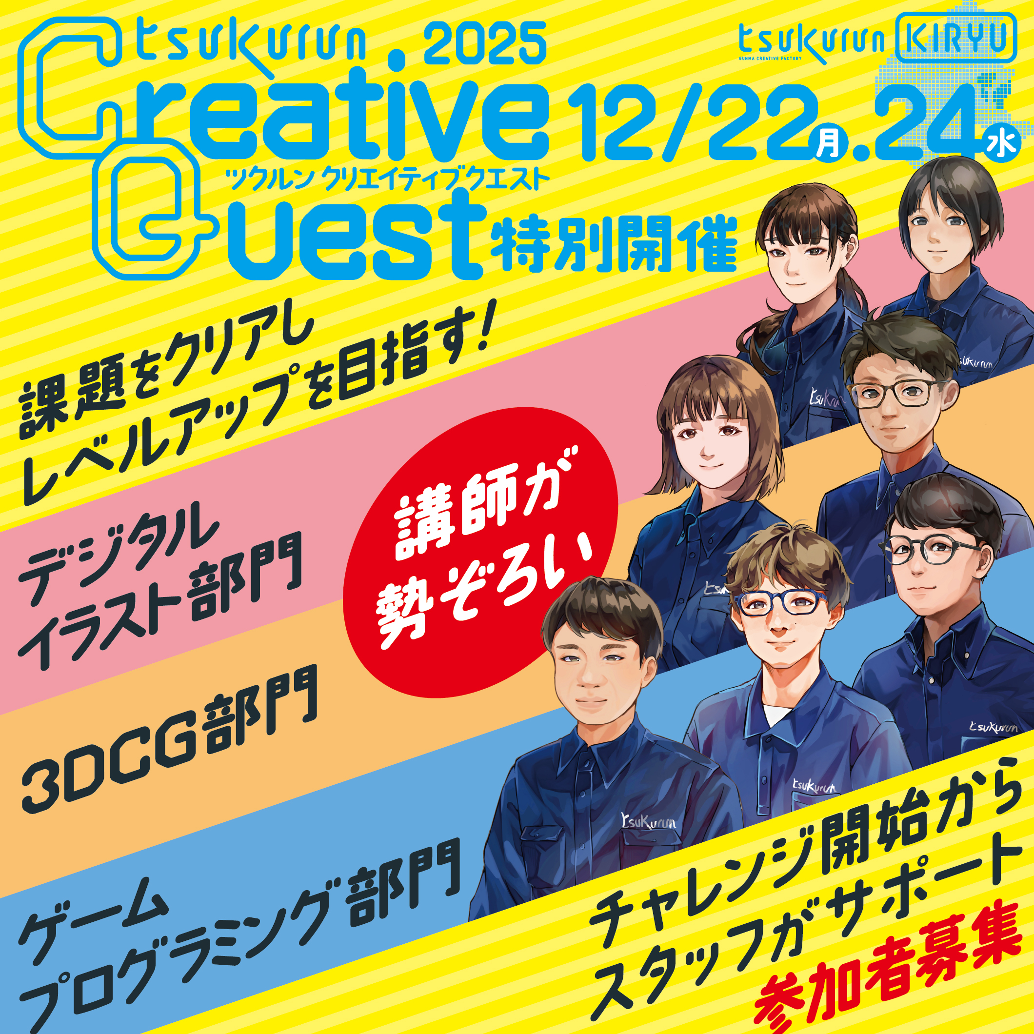 tsukurun KIRYU ☆tsukurun クリエイティブクエスト特別開催☆ 12/22(月) 24(水) デジタルイラスト部門/3DCG部門/ゲームプログラミング部門
