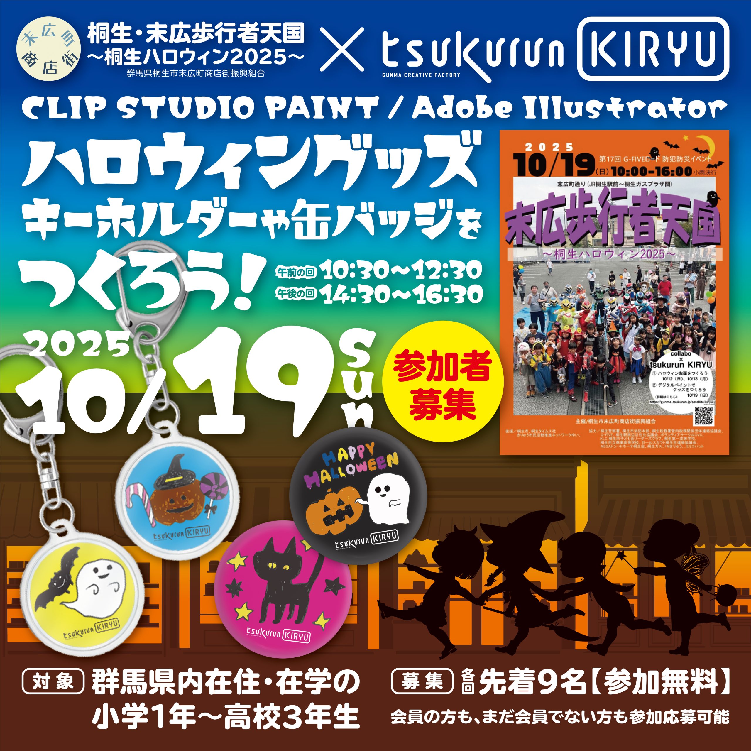 tsukurun KIRYU ☆ 10/19(日) ☆ ハロウィングッズ キーホルダーや缶バッジをつくろう!【桐生・末広歩行者天国 〜桐生ハロウィン2025〜 コラボレーション】