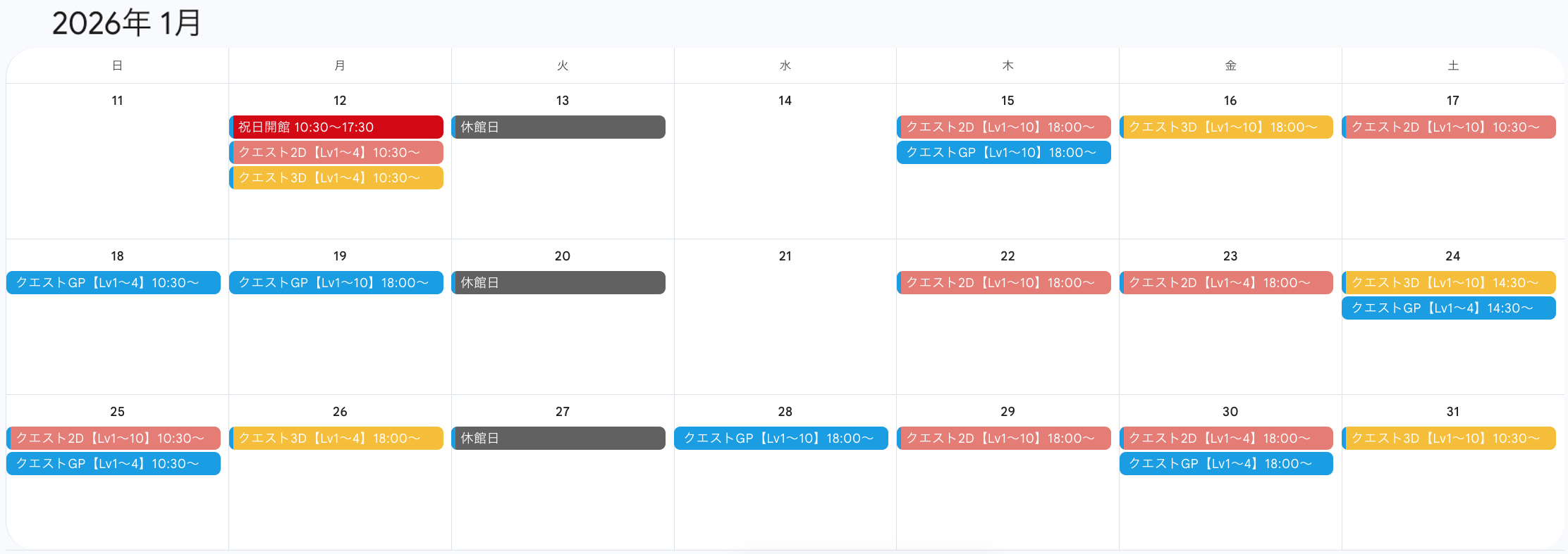 各クエストはメインルームまたはPCルームで約2時間にて実施します。