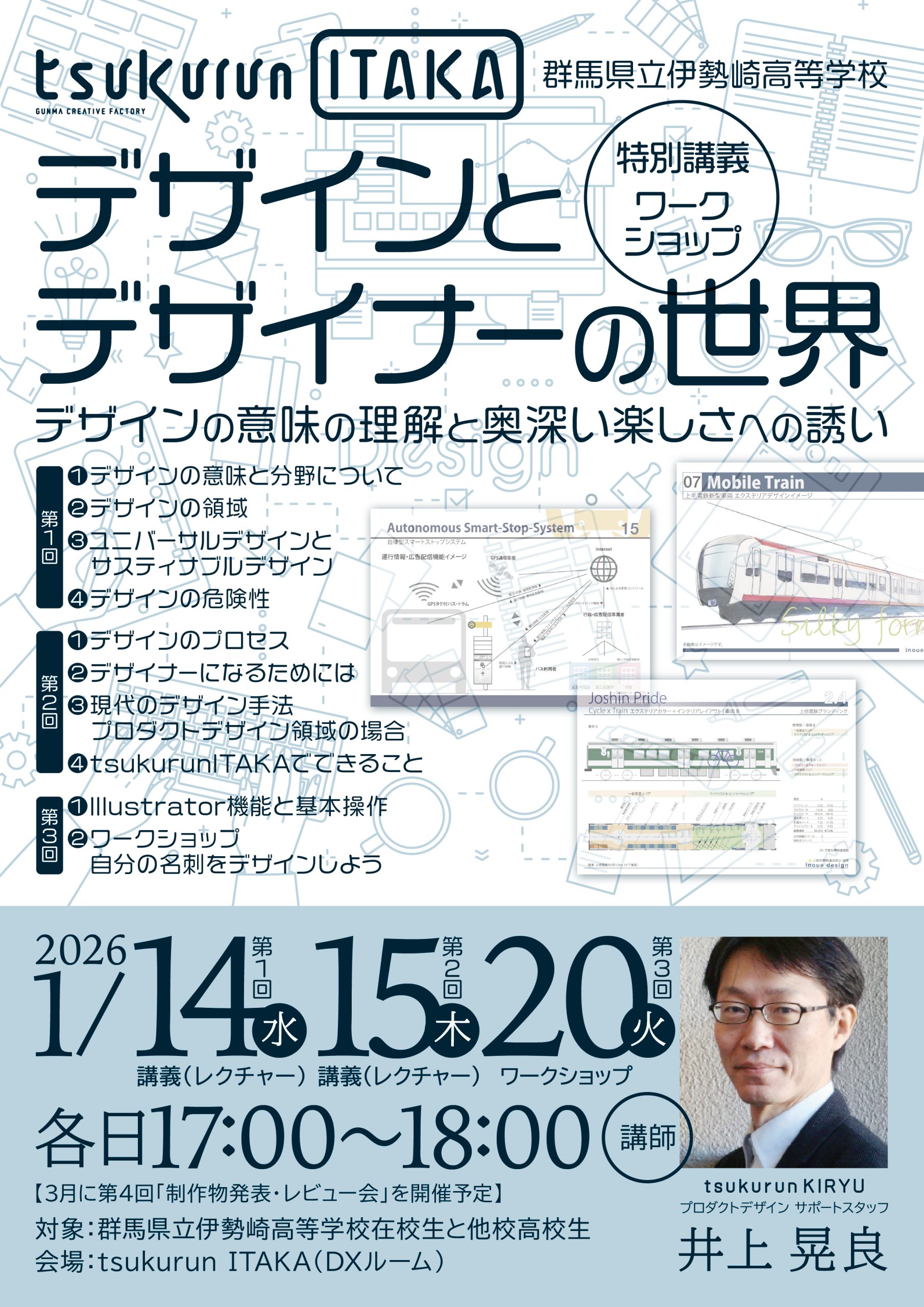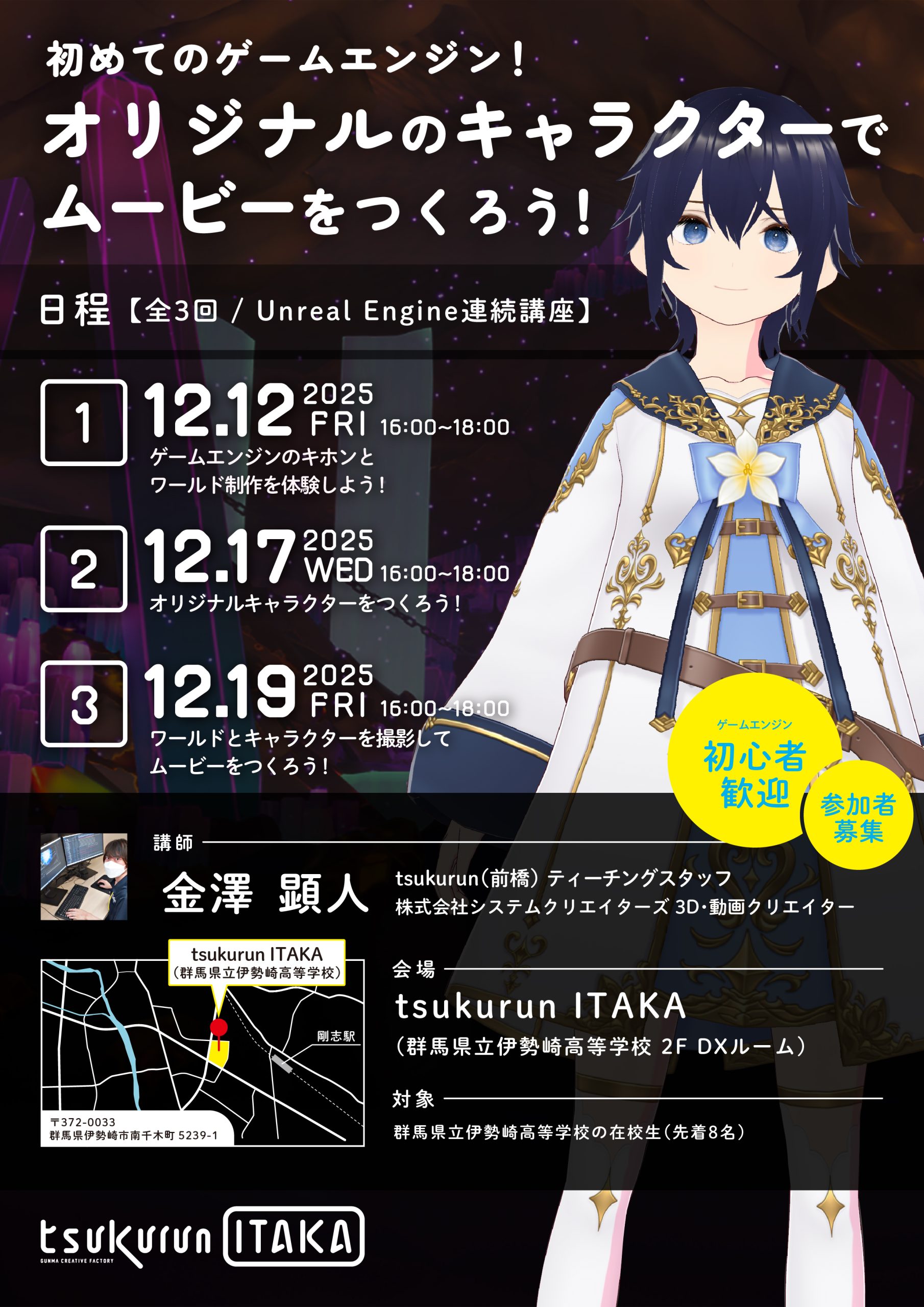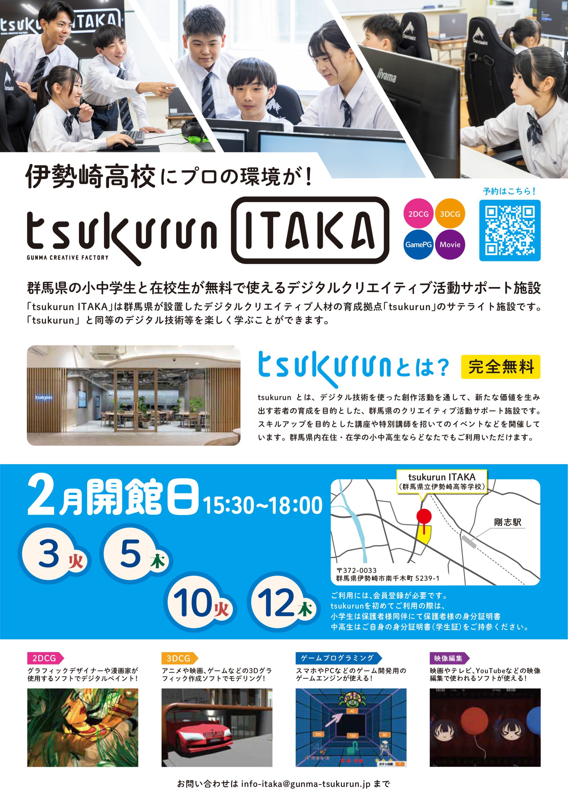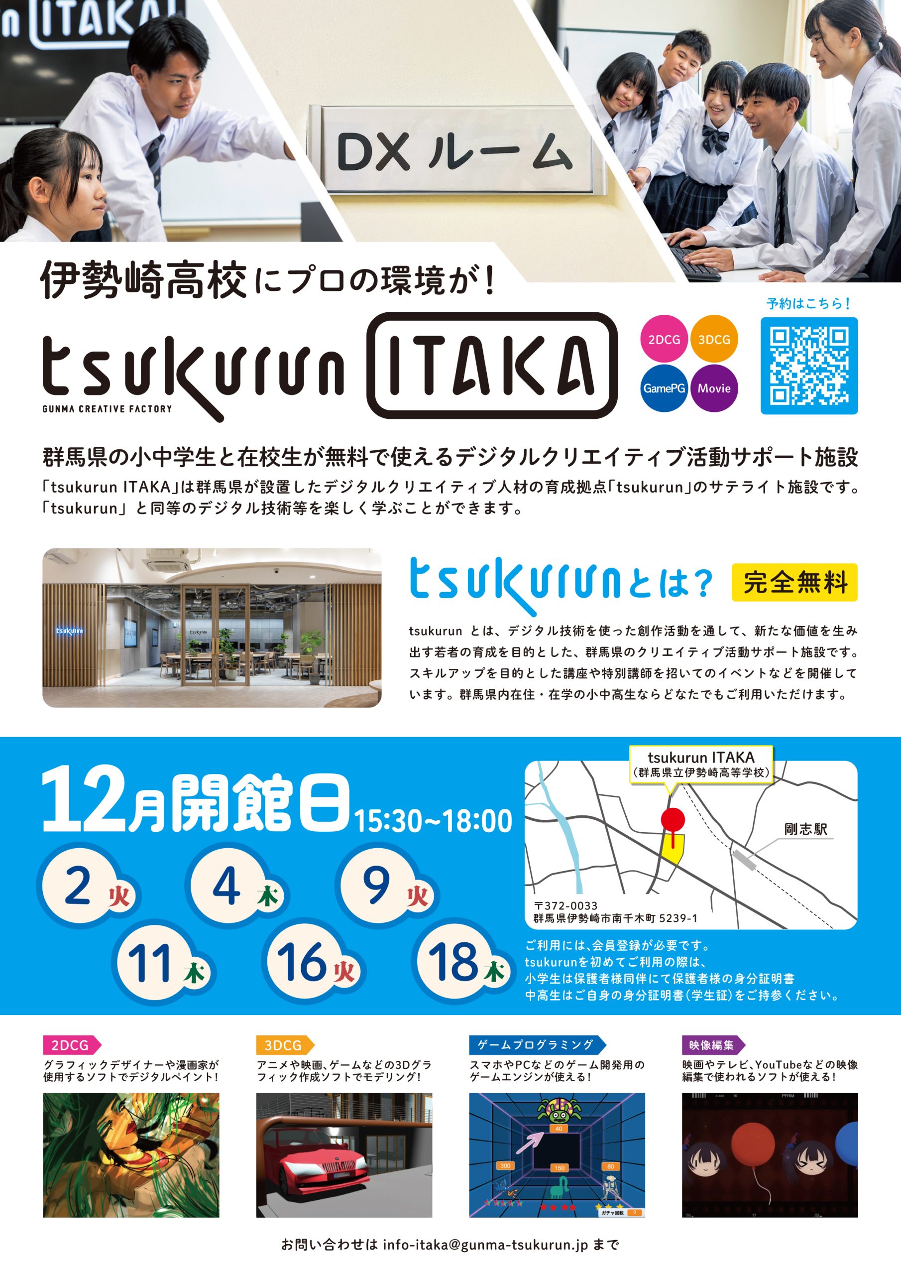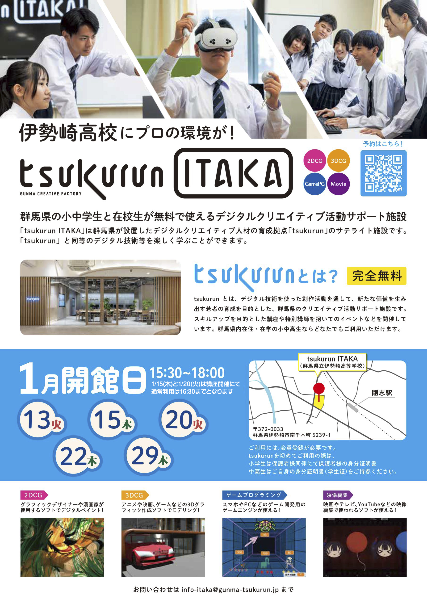 「tsukurun ITAKA」は、群馬県が設置したデジタルクリエイティブ人材の育成拠点「tsukurun」のサテライト施設です。「tsukurun」と同等のデジタル技術等を楽しく学ぶことができます。