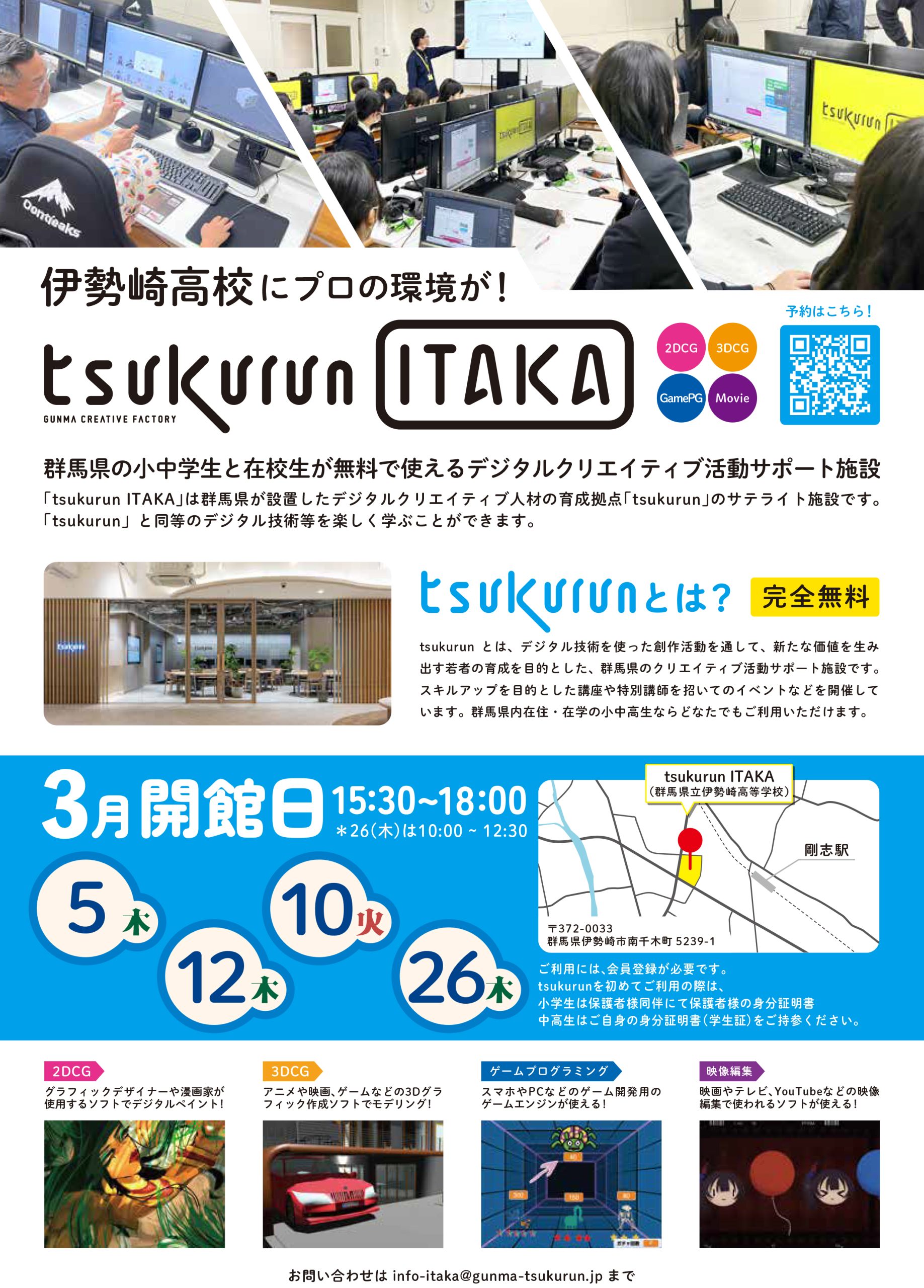 メール: info-itaka@gunma-tsukurun.jp(施設への問合せはメールからお願いします。)