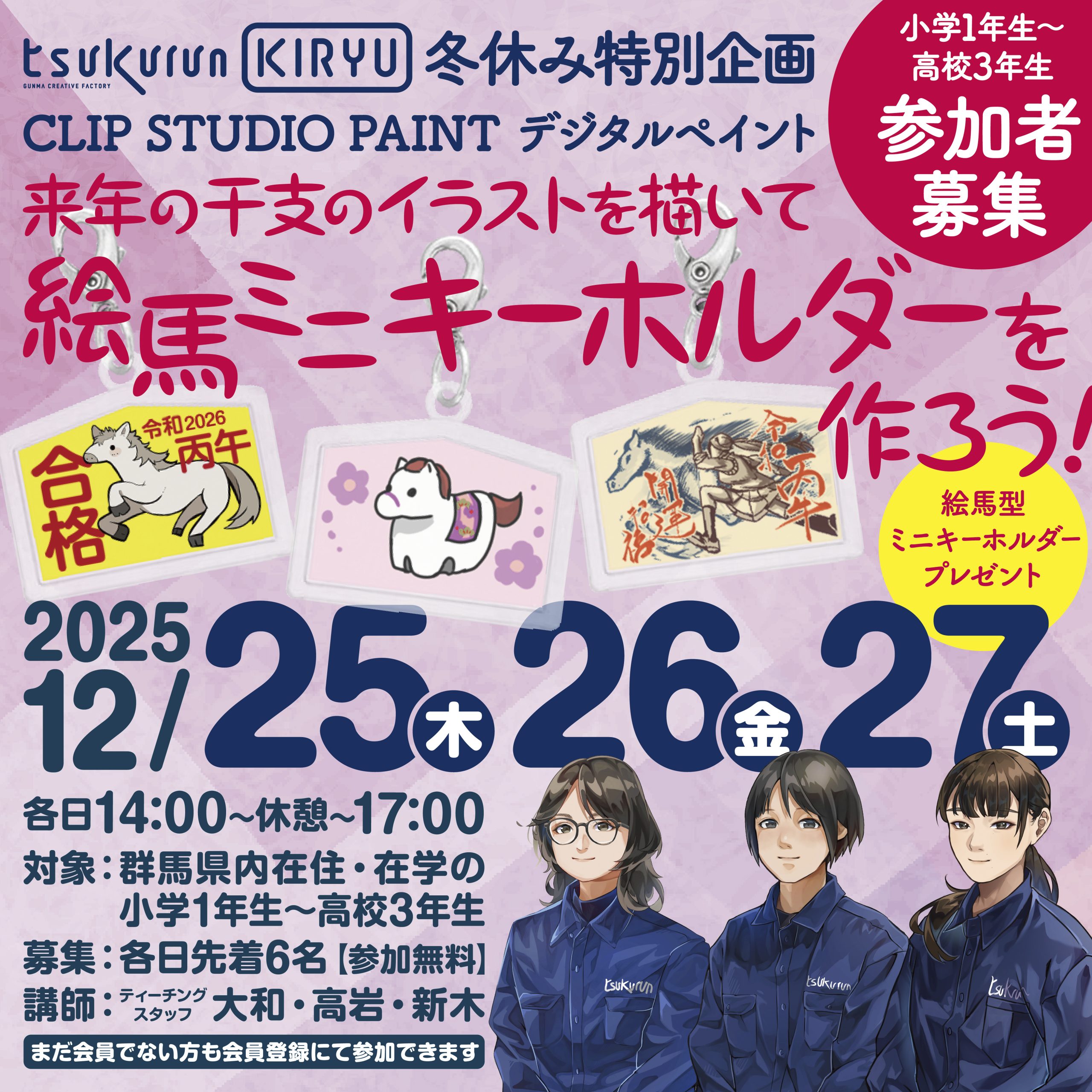 「tsukurun KIRYU」は、群馬県が設置したデジタルクリエイティブ人材の育成拠点「tsukurun」のサテライト施設です。「tsukurun」と同等のデジタル技術等を楽しく学ぶことができます。また、tsukurun KIRYU独自のイベントなども定期的に開催します。