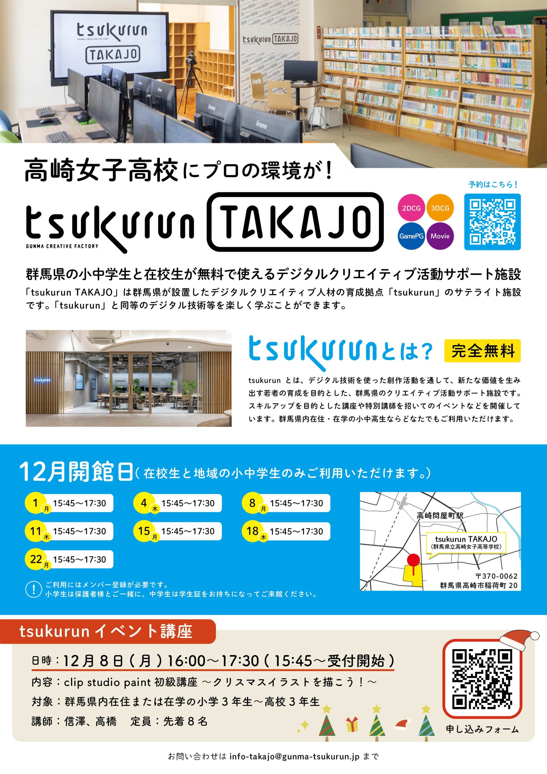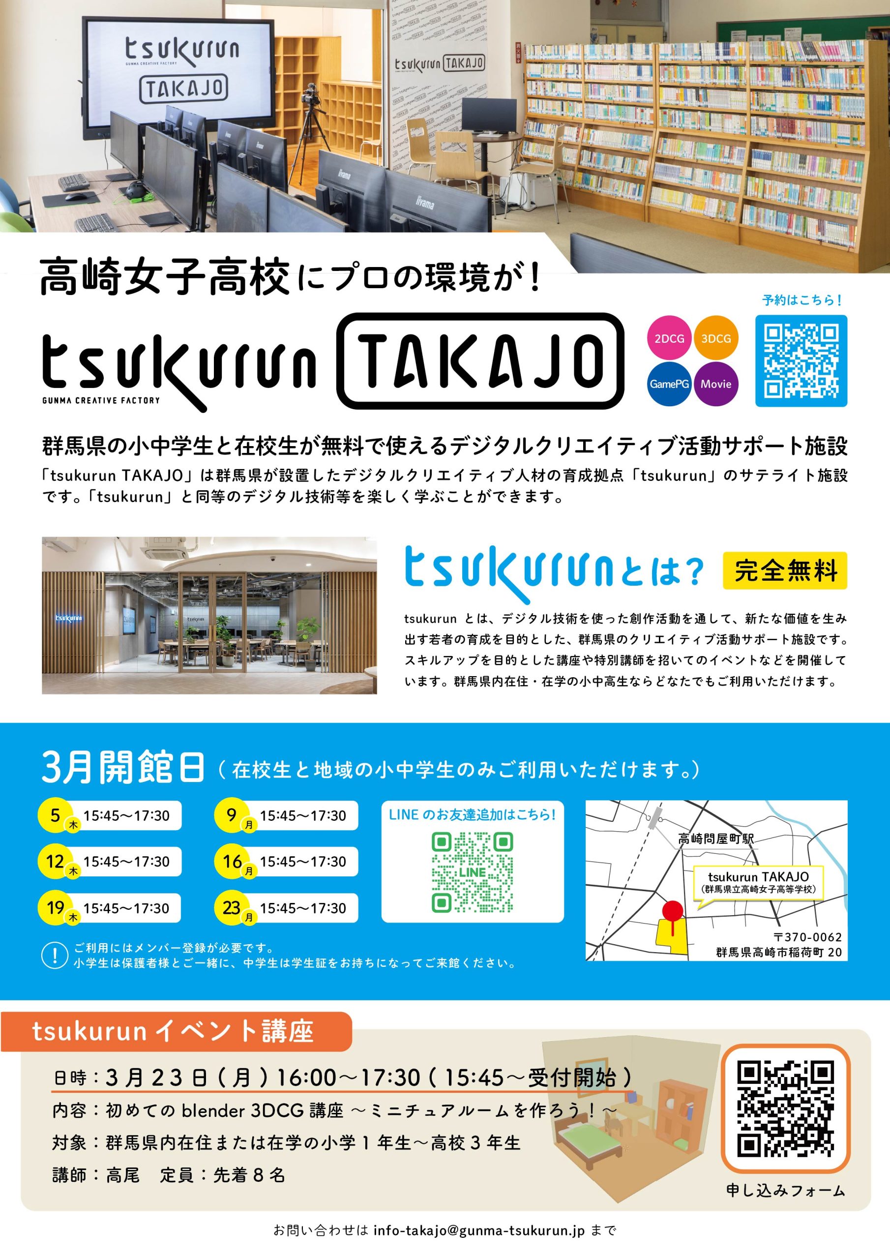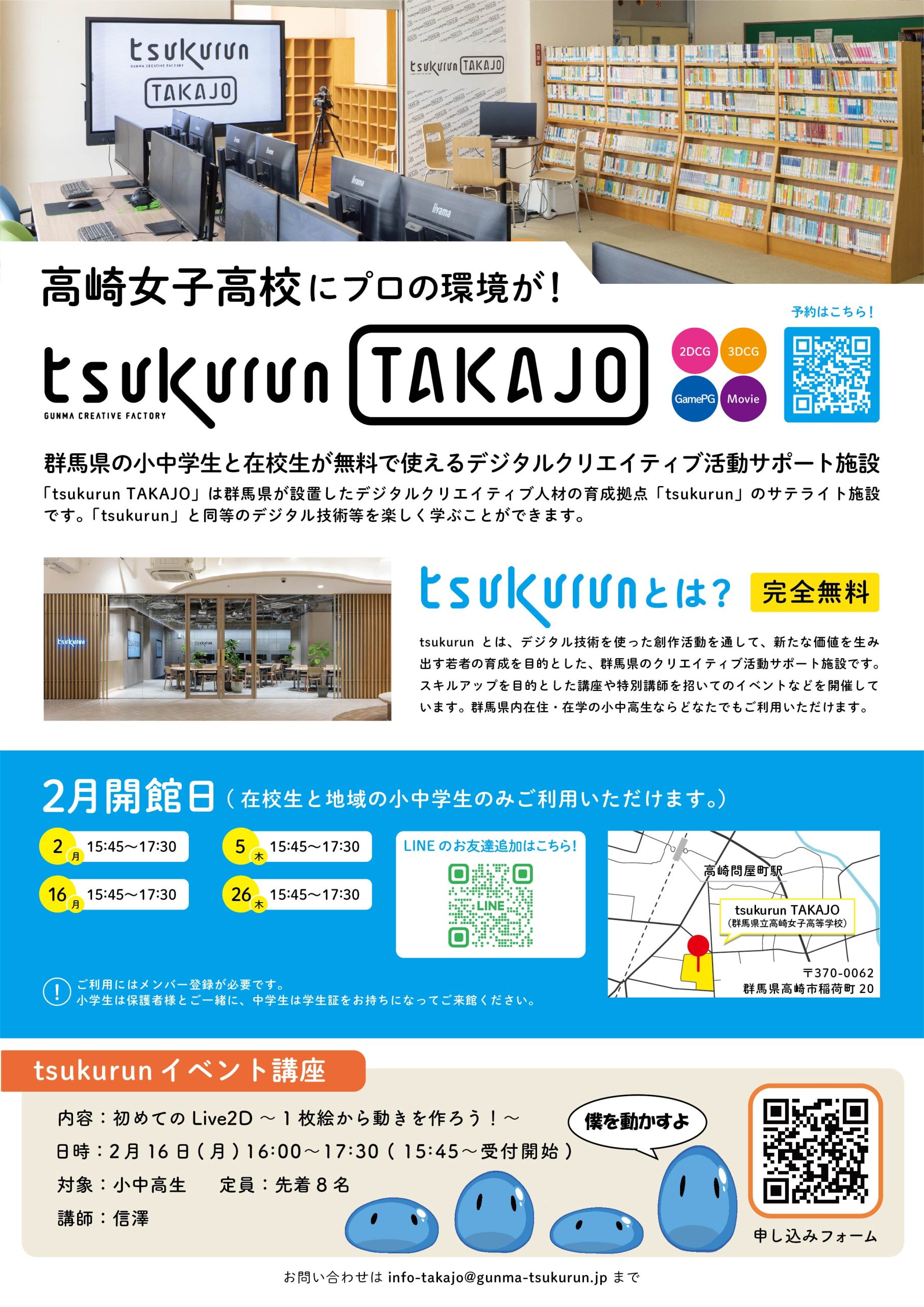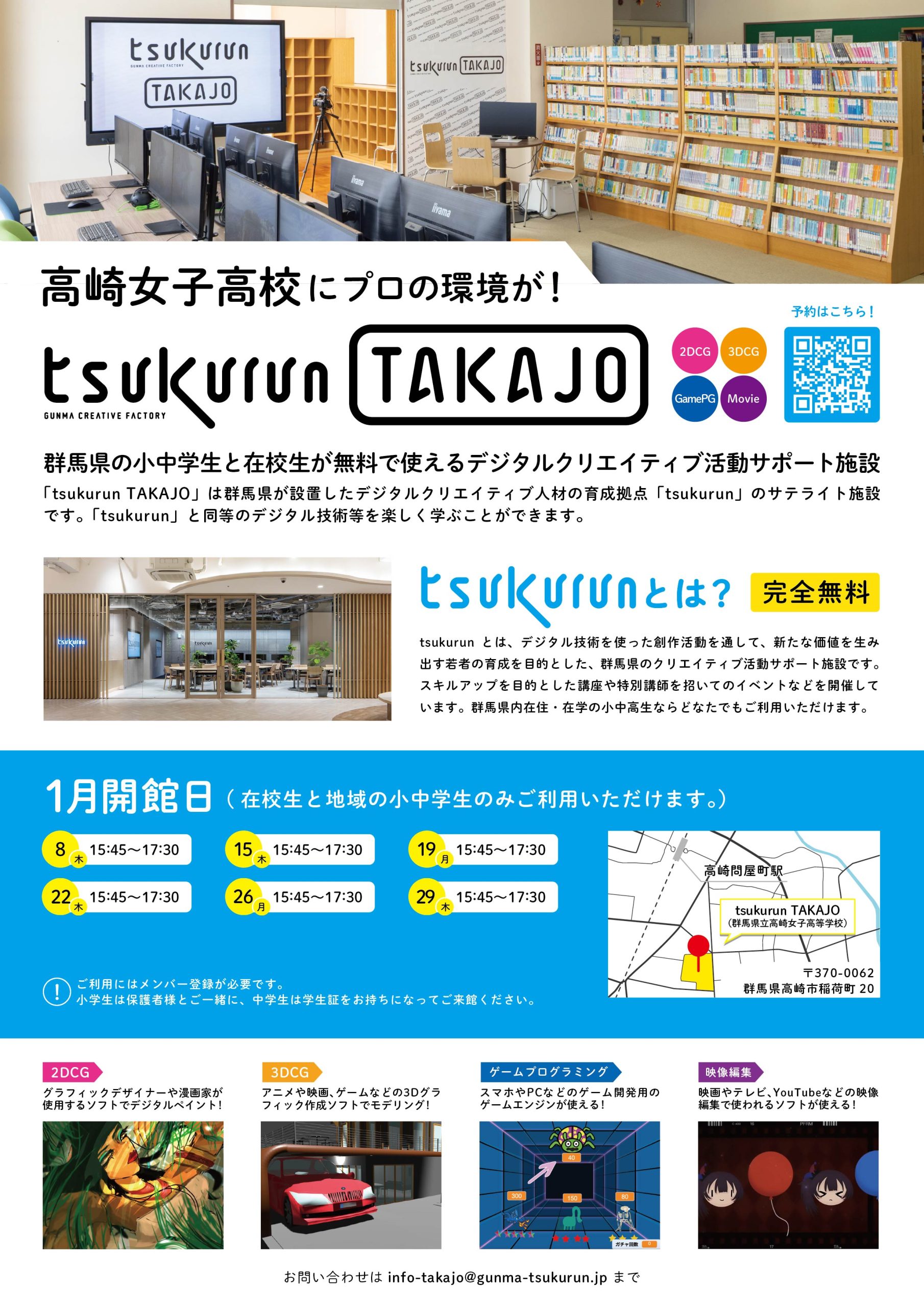 メール: info-takajo@gunma-tsukurun.jp(施設への問合せはメールからお願いします。)
