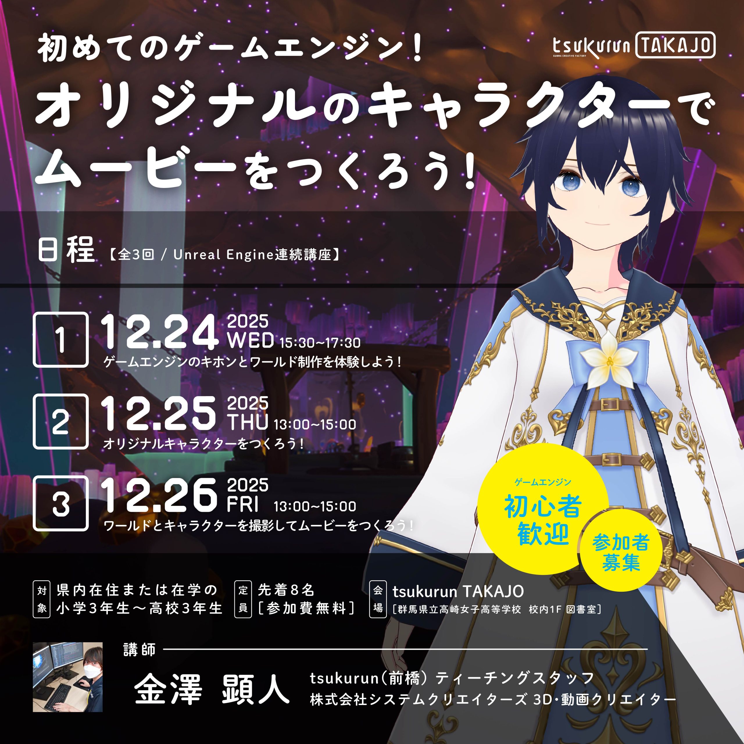 「tsukurun TAKAJO」は、群馬県が設置したデジタルクリエイティブ人材の育成拠点「tsukurun」のサテライト施設です。「tsukurun」と同等のデジタル技術等を楽しく学ぶことができます。